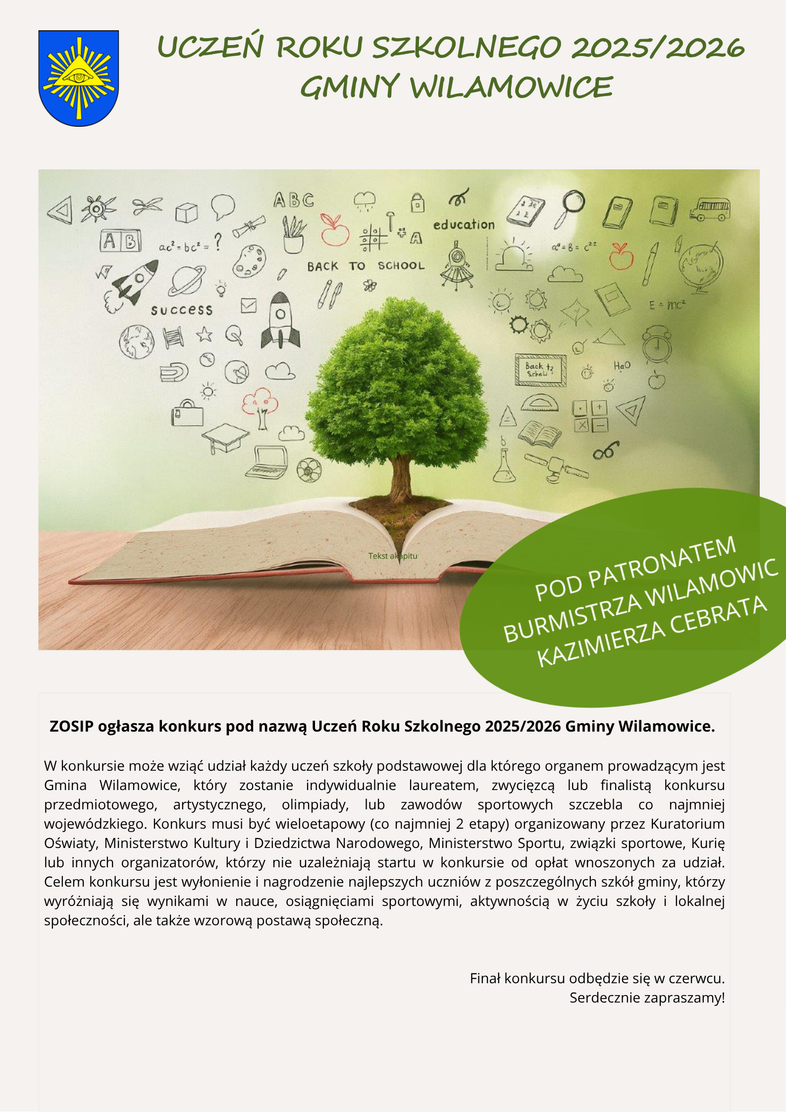 ZOSIP ogłasza konkurs pod nazwą Uczeń Roku Szkolnego 2025/2026 Gminy Wilamowice.